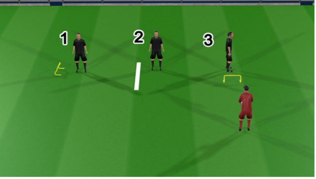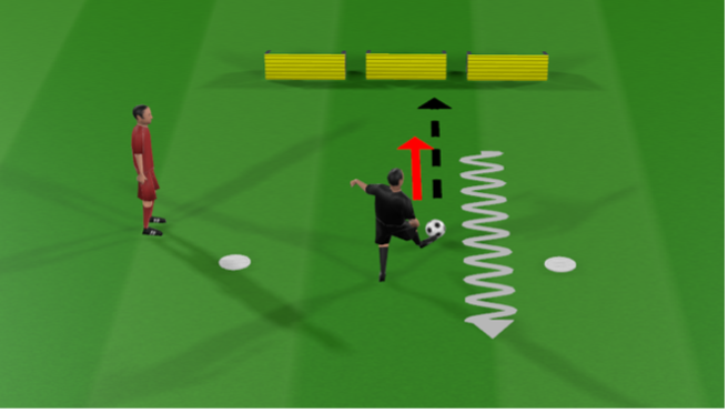 Player performs a 180-degree change of direction move at the bottom of the channel and passes into the coach