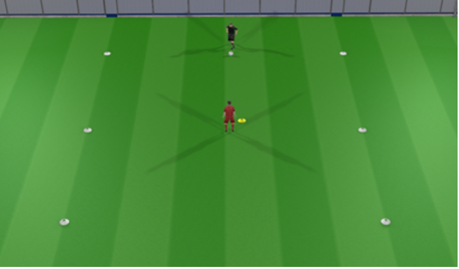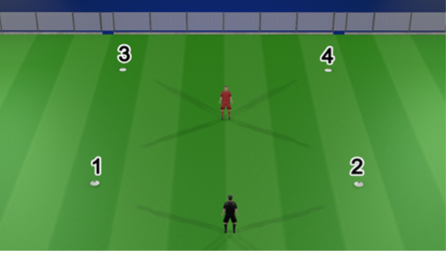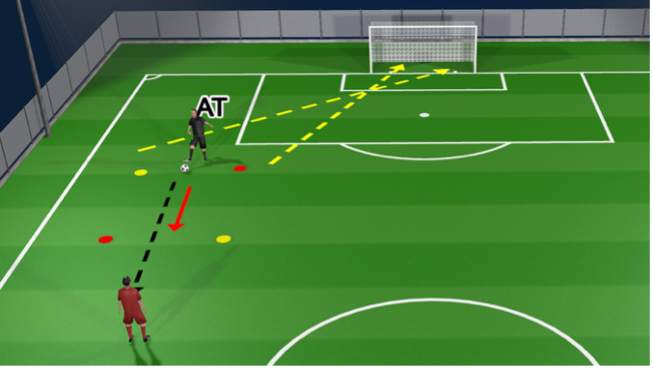 The player then reacts to the colour displayed and has to dribble around both cones before finishing