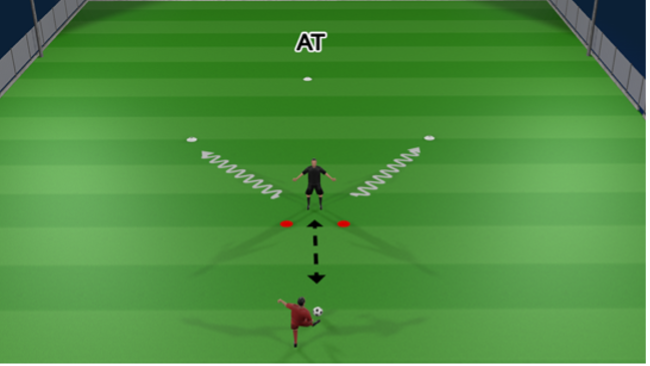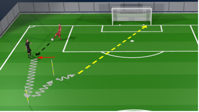 Player receives on the back foot and dribbles towards the further pole and performs a 180-degree change of direction move