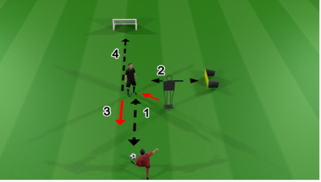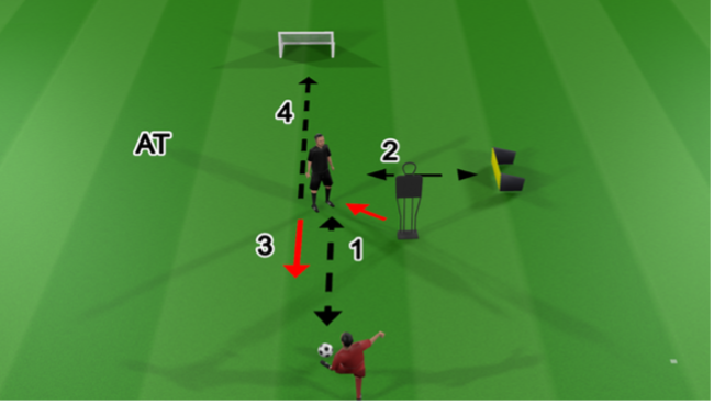 The coach and player then bounce around the right cone and the player then takes a positive first touch before finishing.