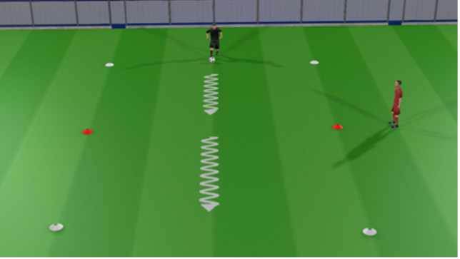Player dribbles halfway up the channel and when inline with the red markers, performs a stop-start move