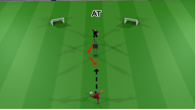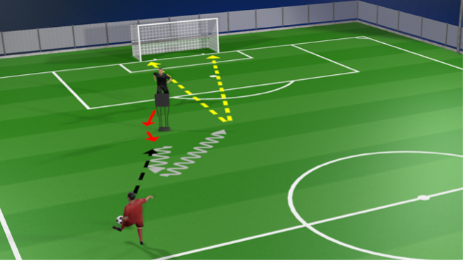 If they see “Pressure” they should take their touch to separate, perform a Feint move and turn, then pass into the goal.